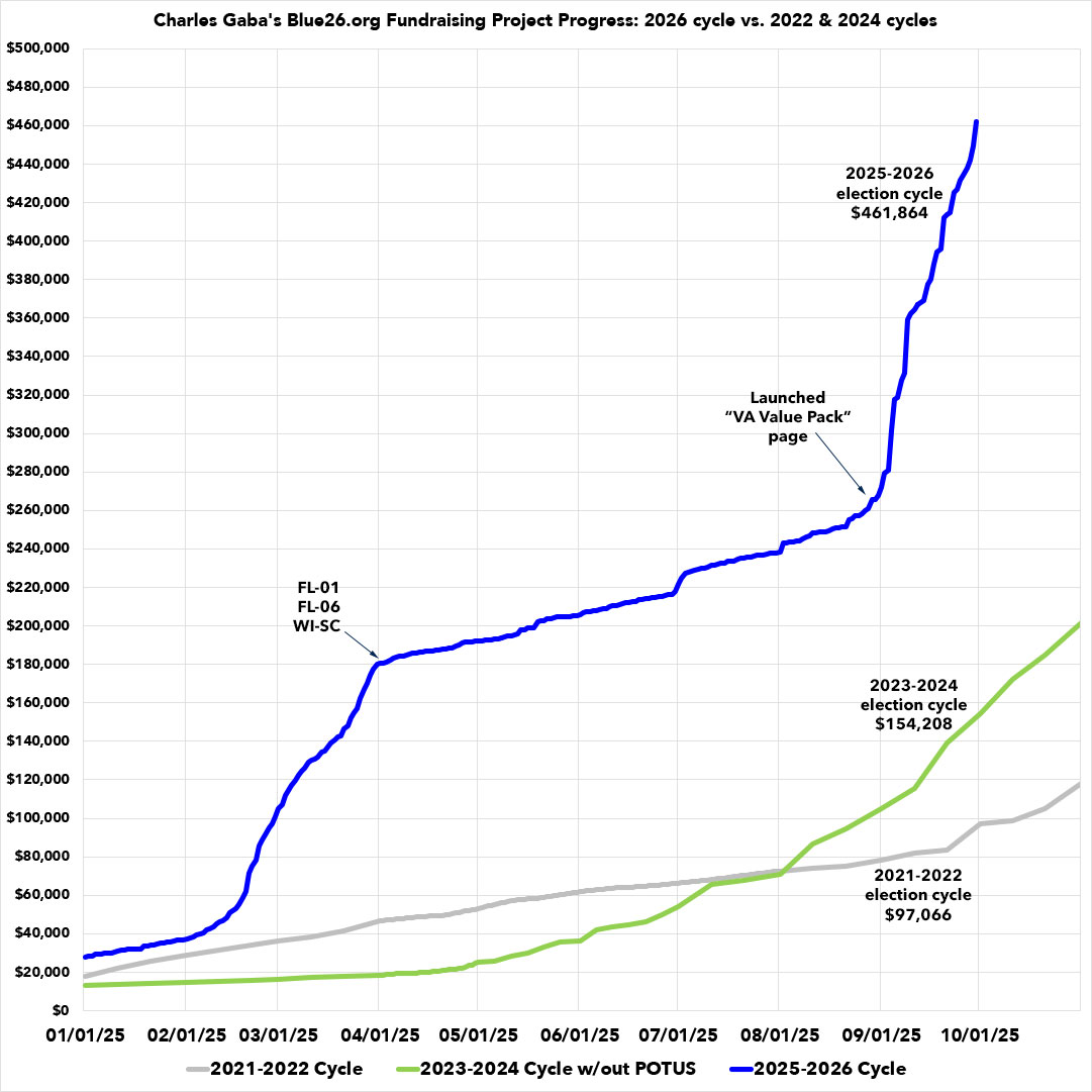 Besides the normal ramping up as we approach Election Day 2025 that you'd normally expect, by far the biggest boost in September came from launching the strategic "Virginia Value Pack" page of Democrats running in deep red districts in late August. This page alone has generated nearly $120,000 for state legislative Dems, $114,000 of which was raised in September...nearly 60% of the total for the month.